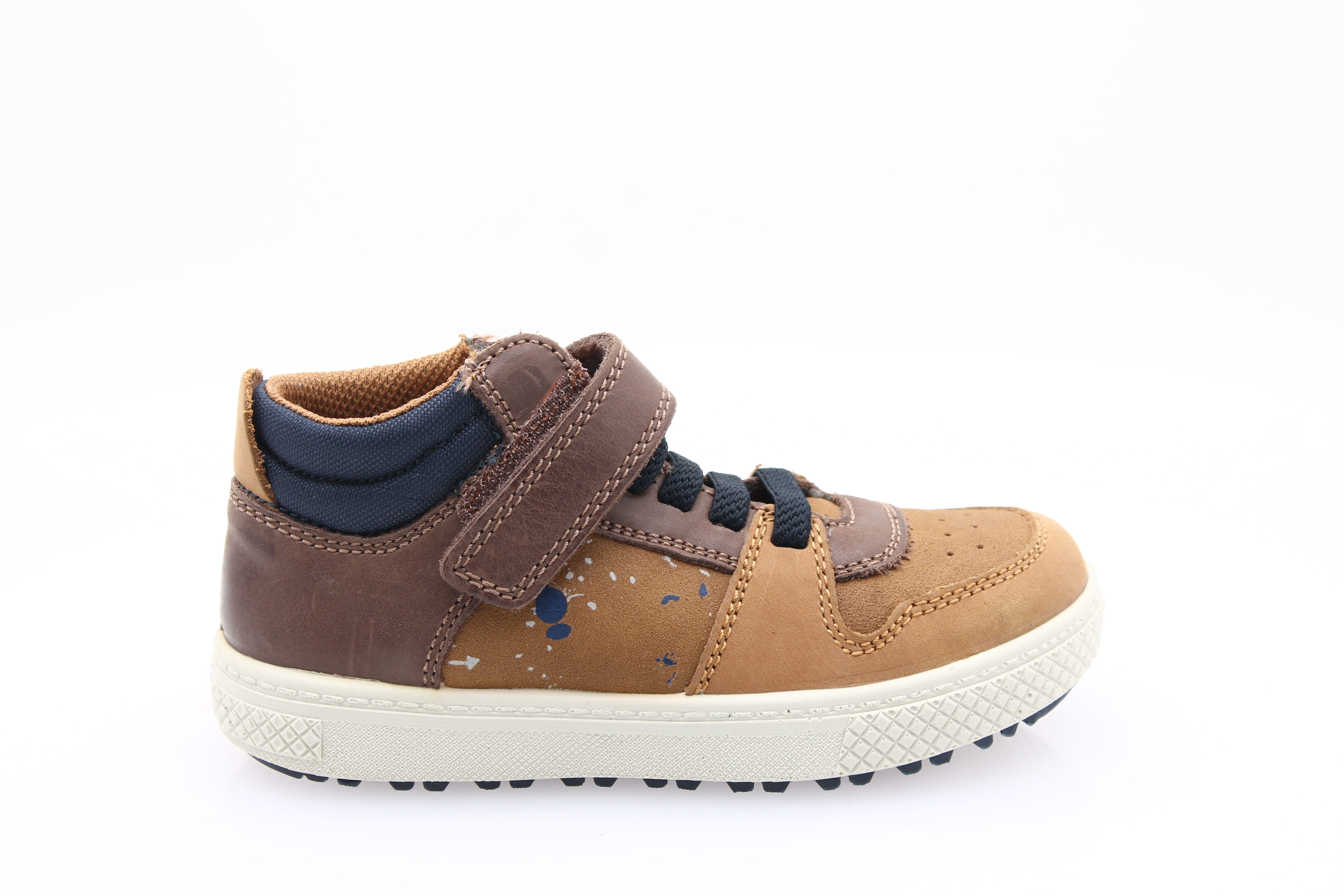 These brown PRIMIGI children's sneakers have black laces and a practical Velcro strap at the top.