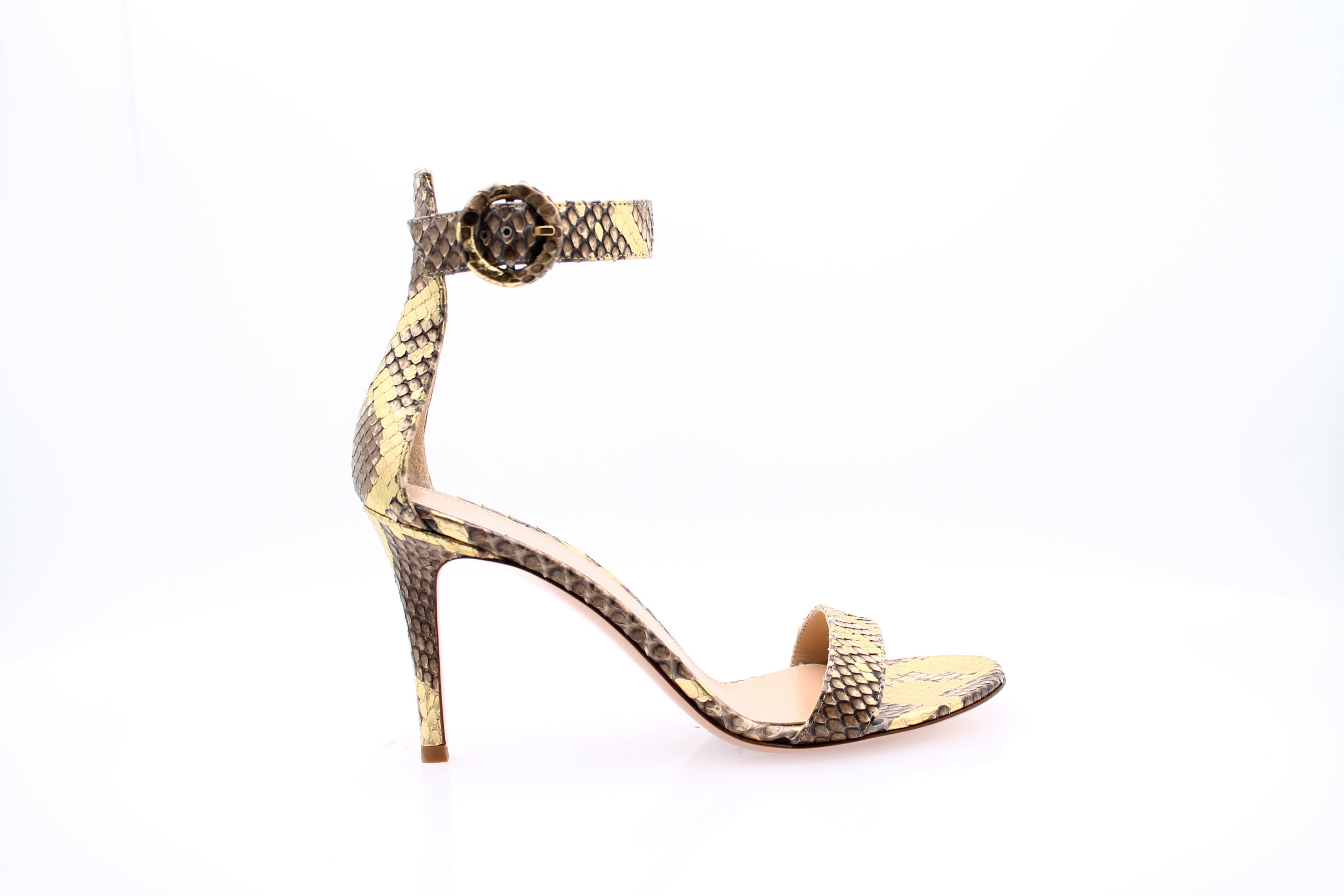 Élégance intemporelle et raffinement italien s’unissent dans les sandales Portofino 85 signées Gianvito Rossi. Confectionnées en cuir effet python métallisé dans une teinte Wild Metal Camel, elles séduisent par leur allure chic et audacieuse.