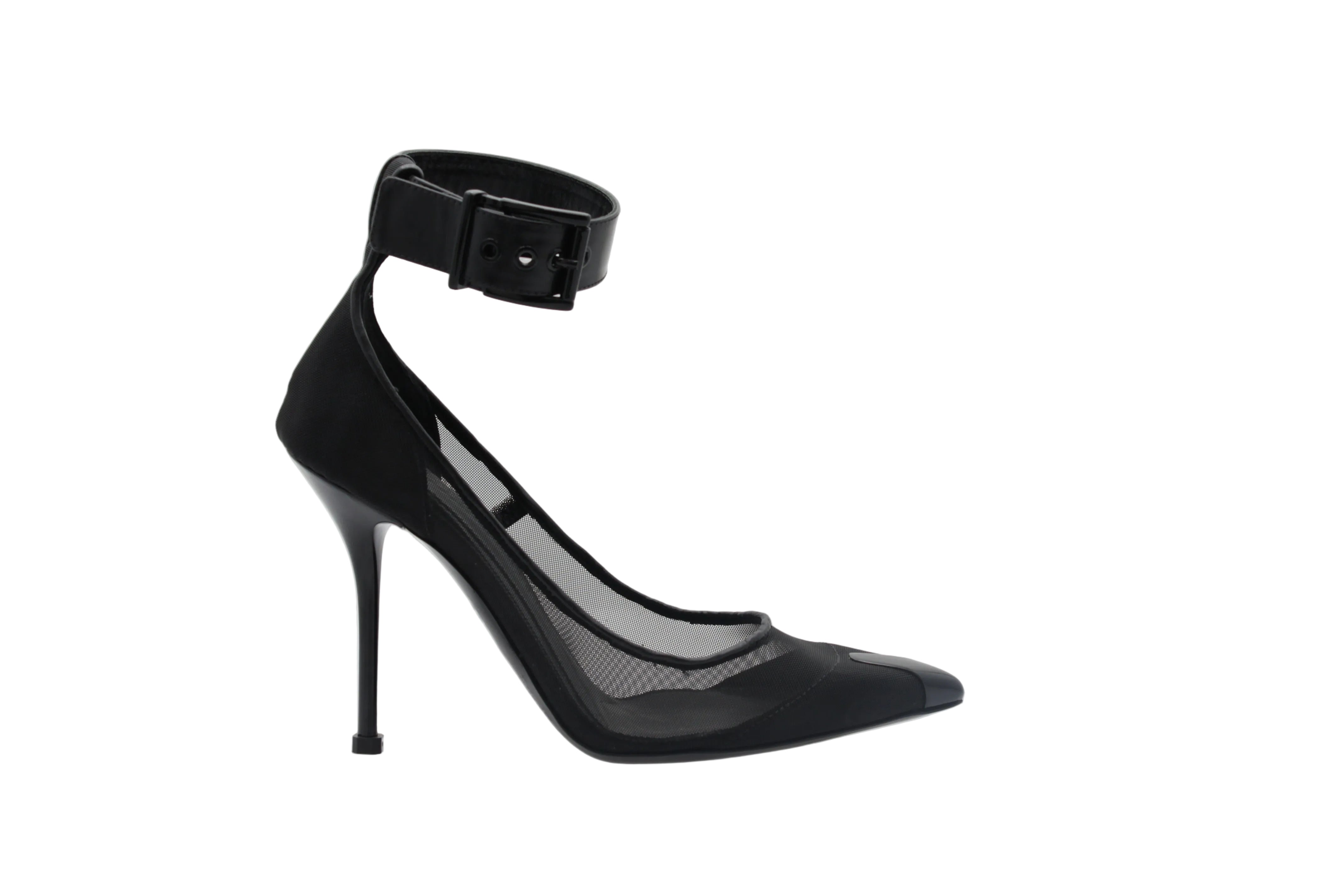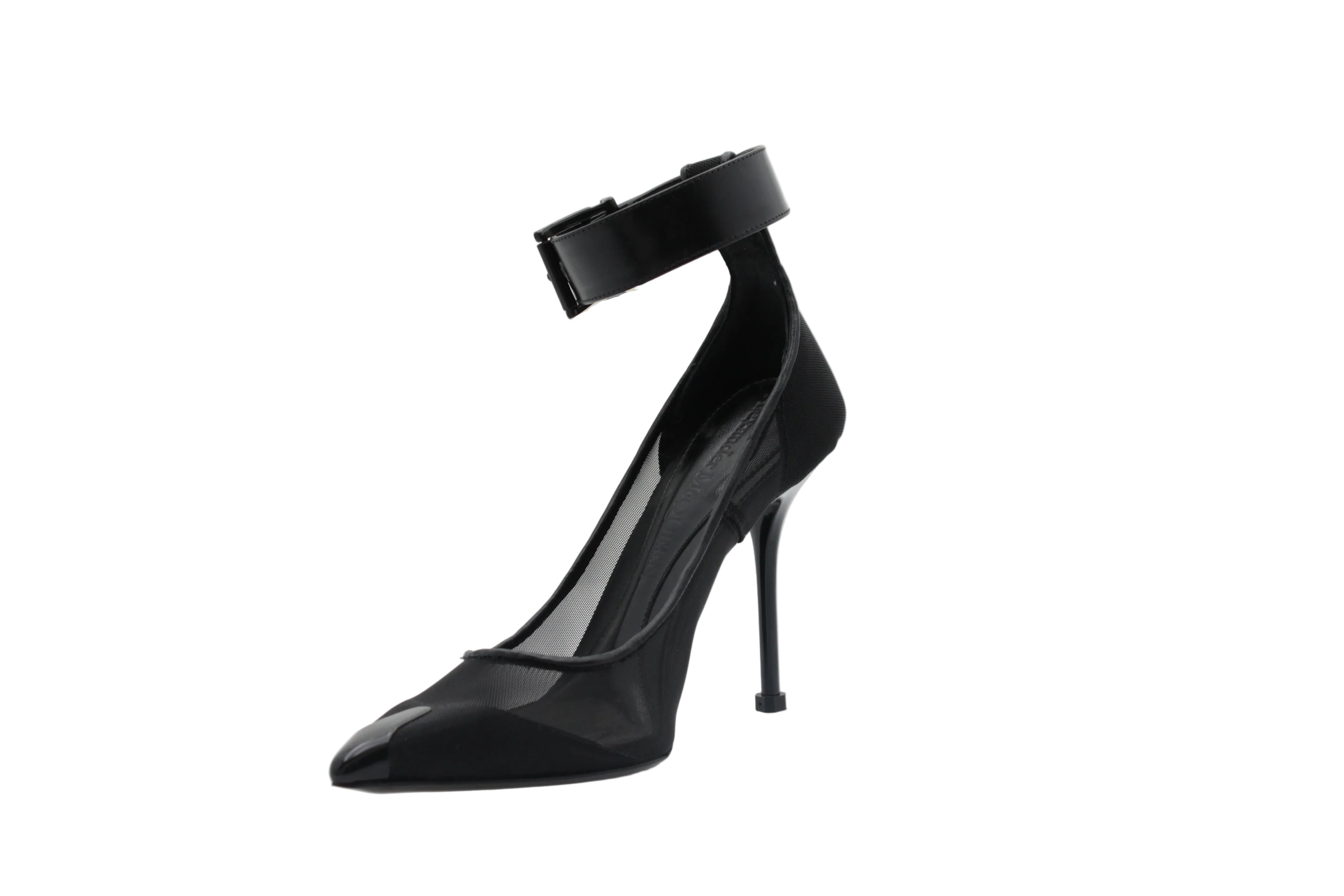 Confectionné en cuir lisse et mesh transparent, cet escarpin McQueen joue subtilement sur les contrastes de matières. Le mesh dévoile le pied avec légèreté et modernité, tandis que les empiècements en cuir structurent la chaussure et renforcent son impact visuel.