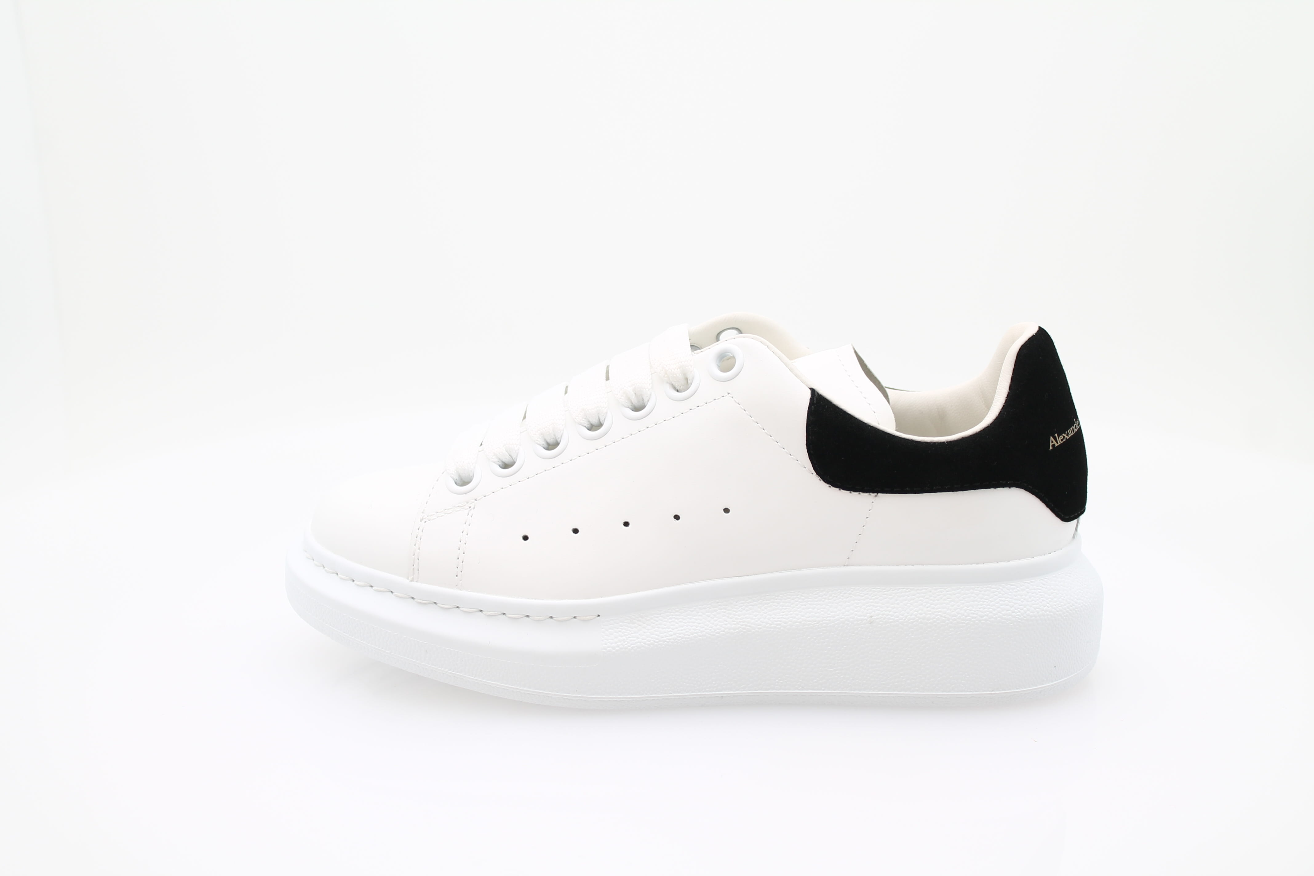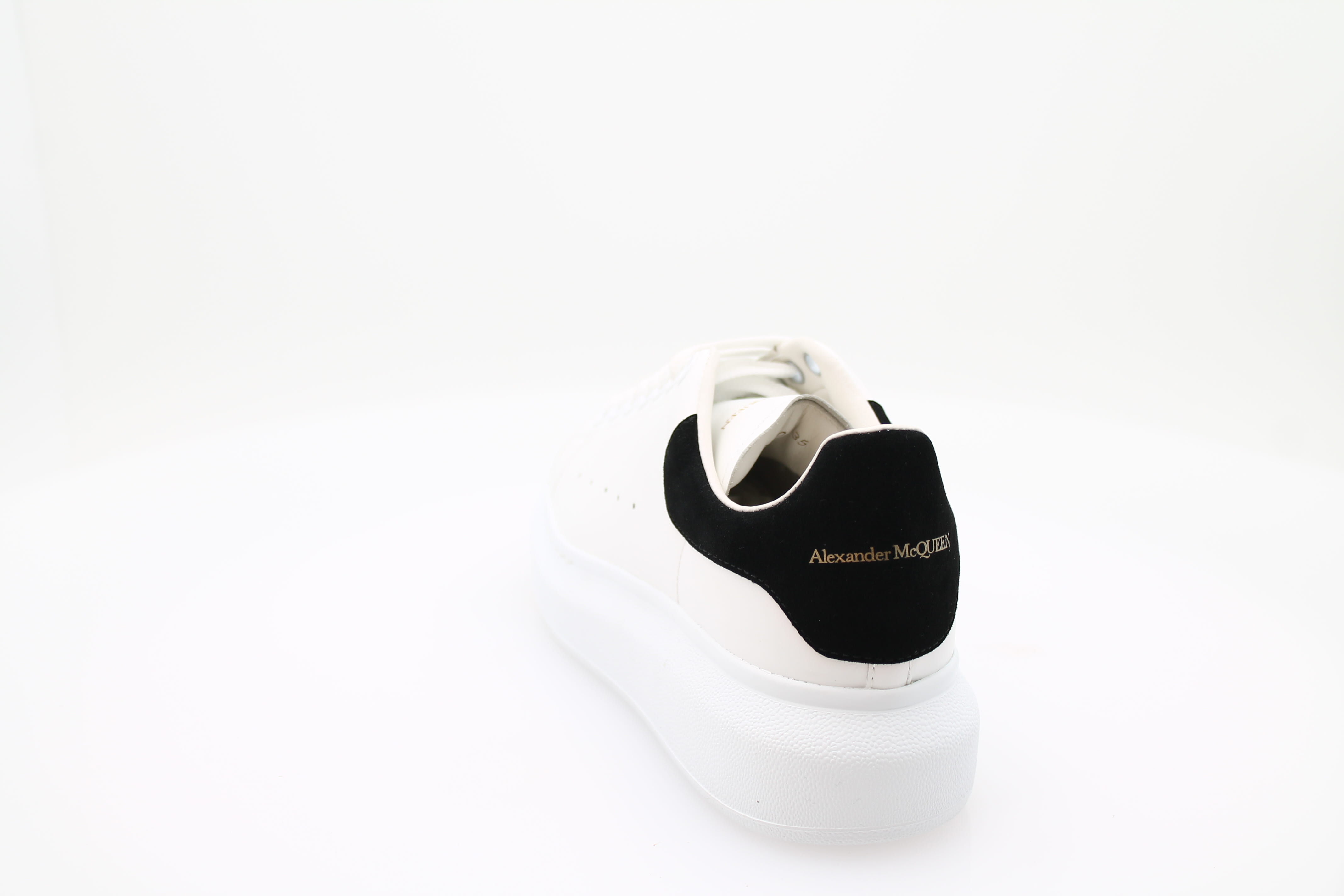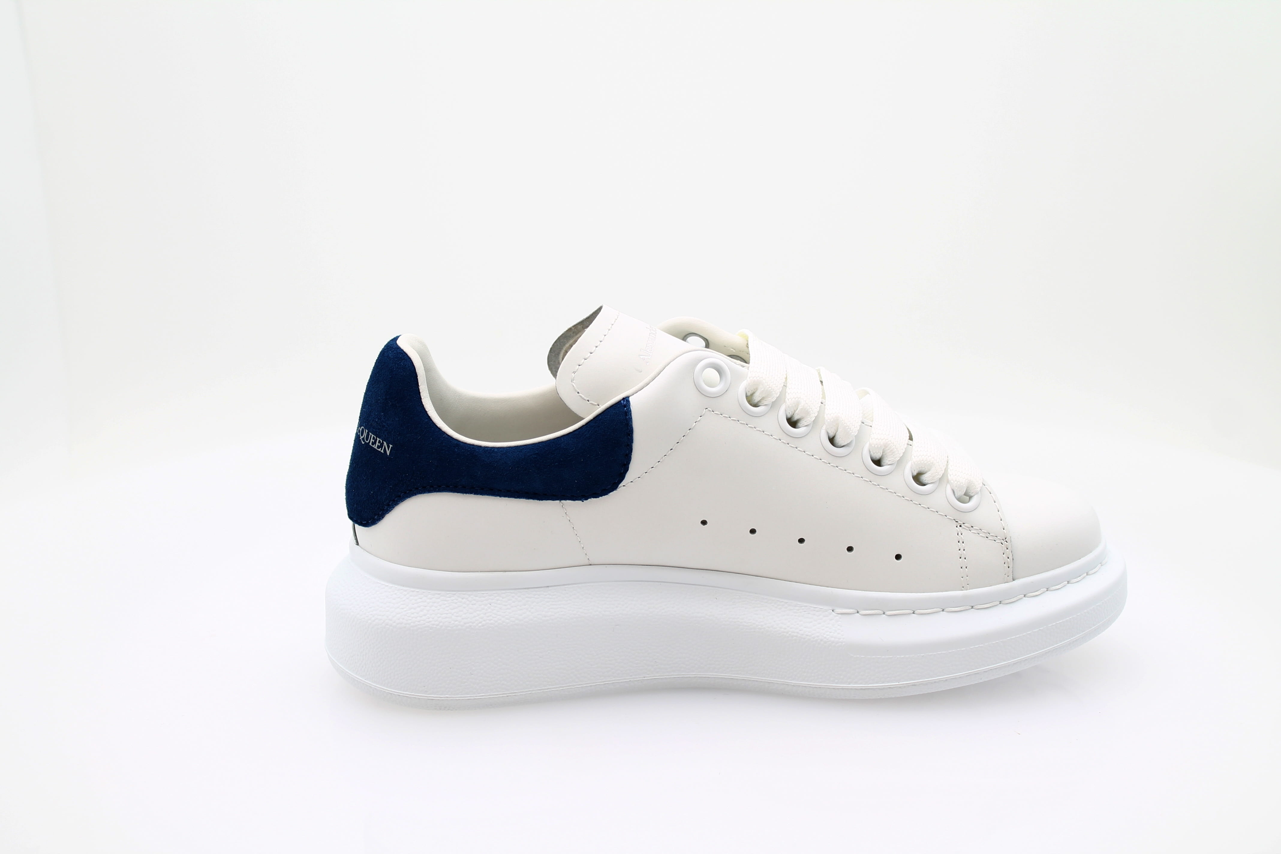 Sneaker à lacets Alexander McQueen en cuir blanc, élégante et confortable. Le talon est orné d’un motif noir, tandis que le nom de la marque est visible à l’arrière et sur la languette. Un modèle raffiné et facile à porter au quotidien.