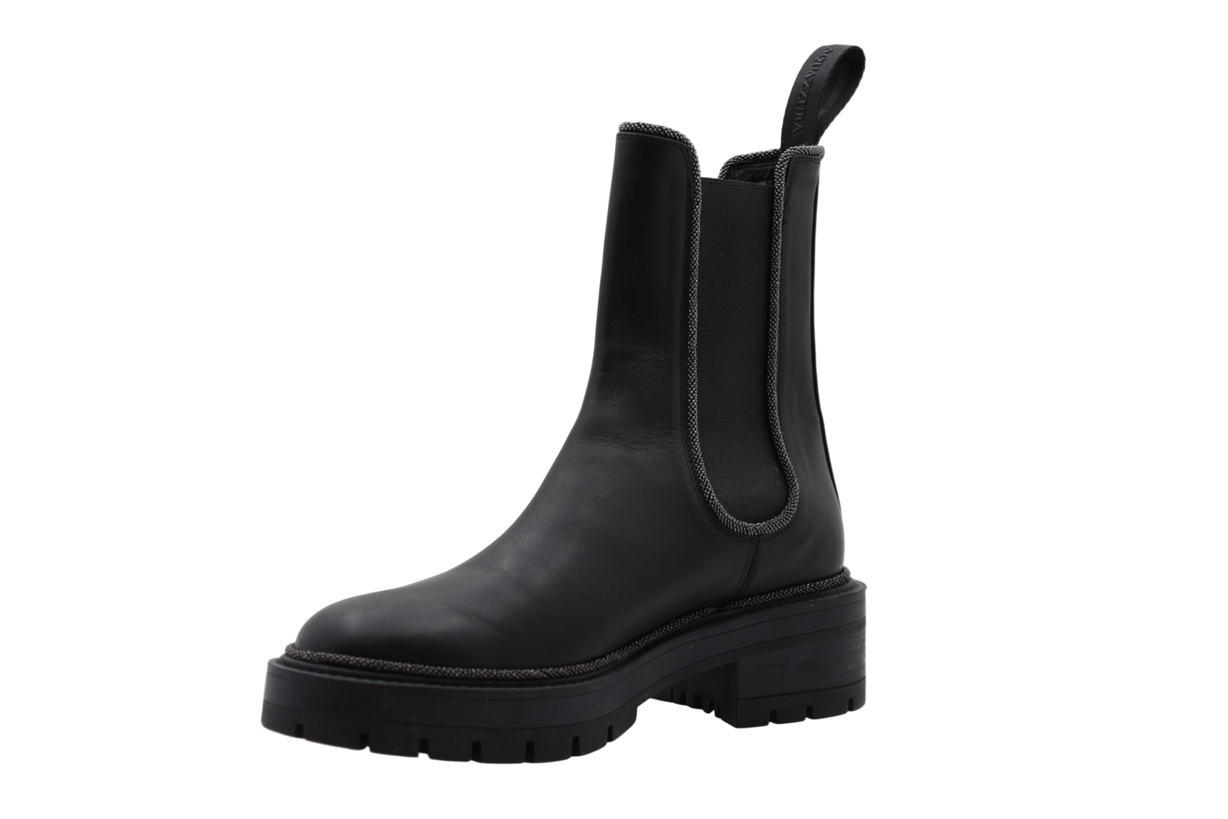 Les Blake Combat Boots de la maison Aquazzura allient esprit urbain et élégance contemporaine. Fabriquées en cuir noir de haute qualité, ces bottines à enfiler se démarquent par leurs détails de strass à paillettes qui ajoutent une touche de lumière à une silhouette minimaliste et puissante. L’association parfaite entre style militaire chic et finition glamour, pour une chaussure aussi pratique que sophistiquée.