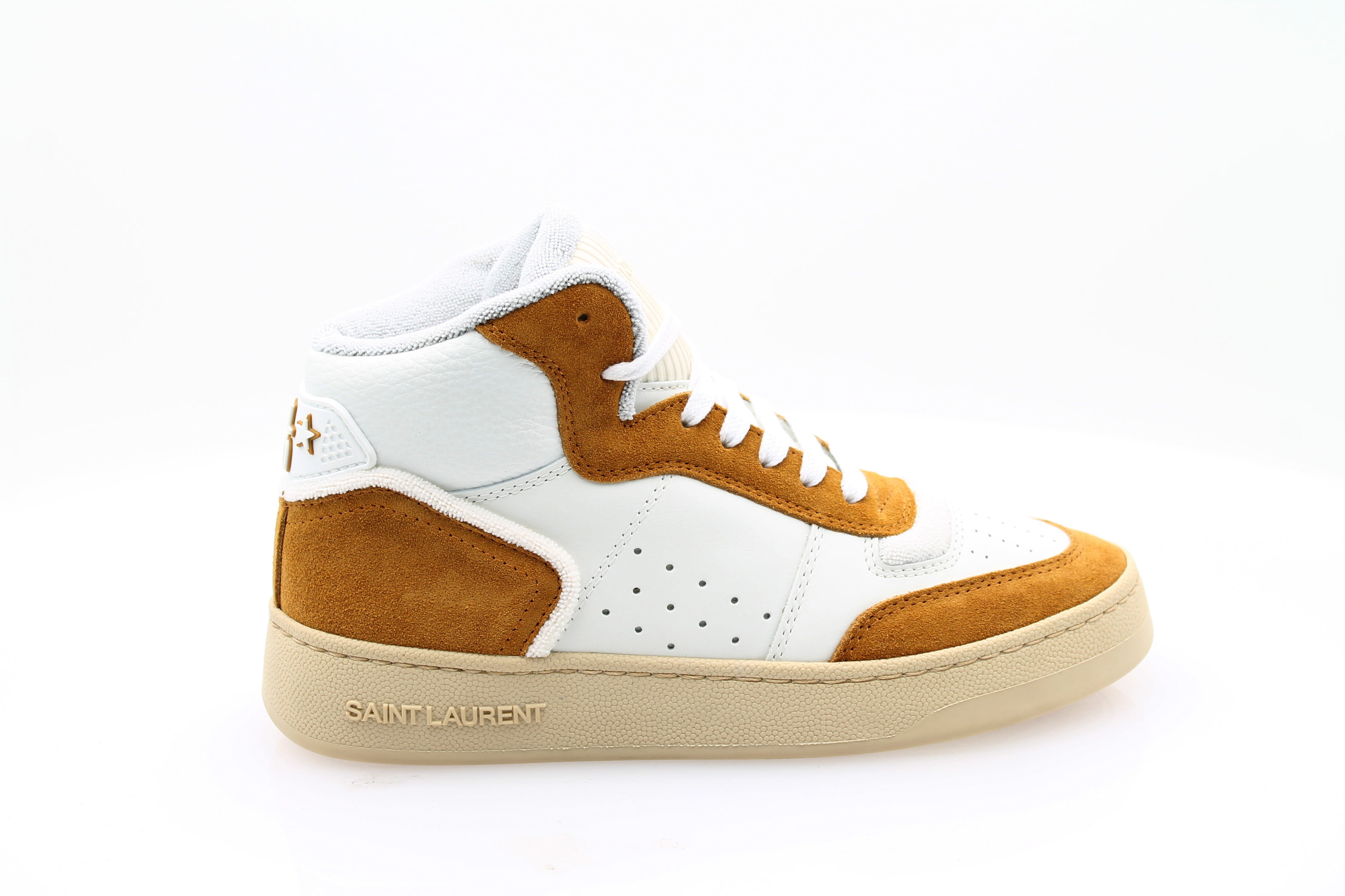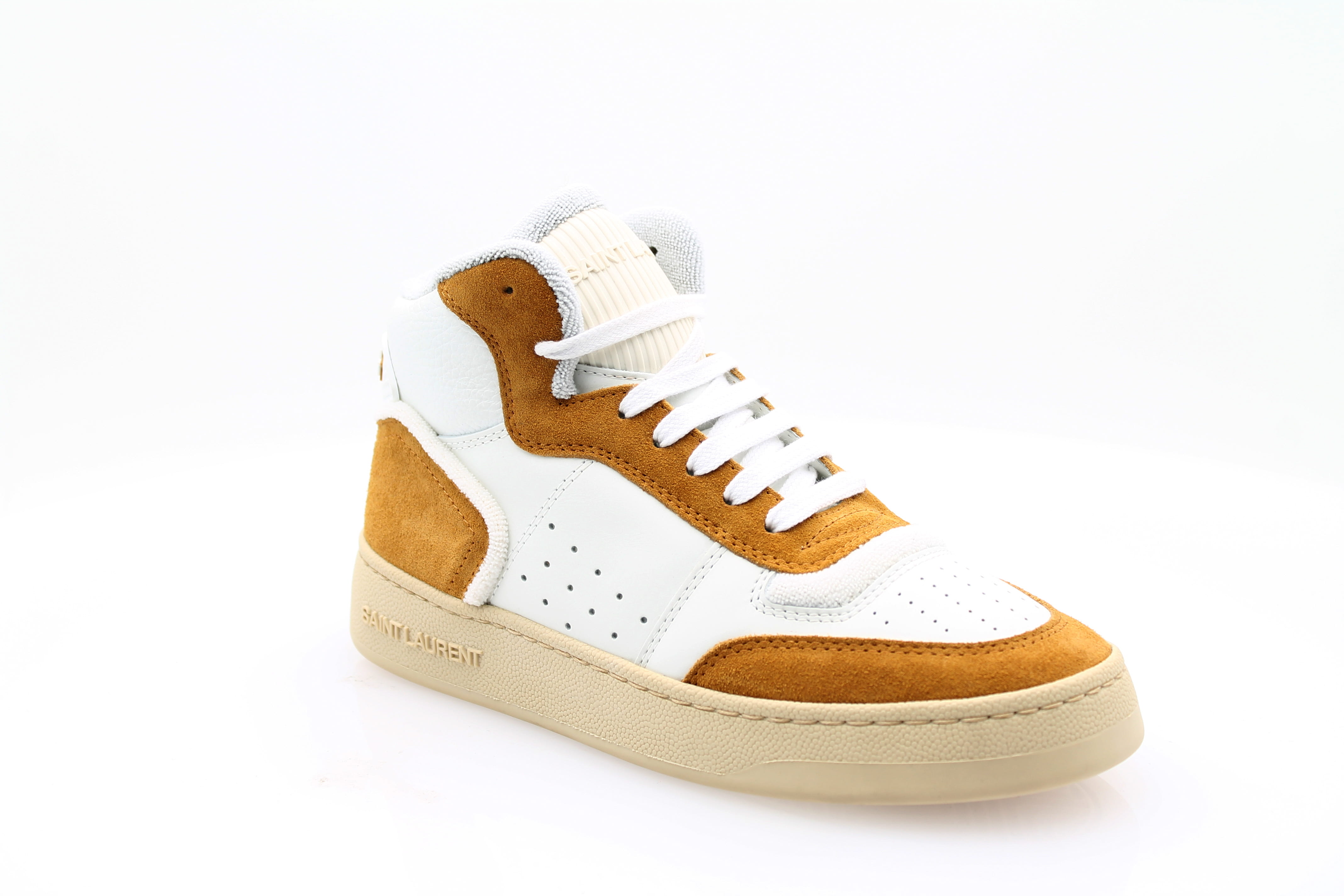 Confectionnées en cuir de veau de qualité, ces baskets montantes présentent un mélange de couleurs moutarde et blanches, offrant un contraste vibrant et élégant.