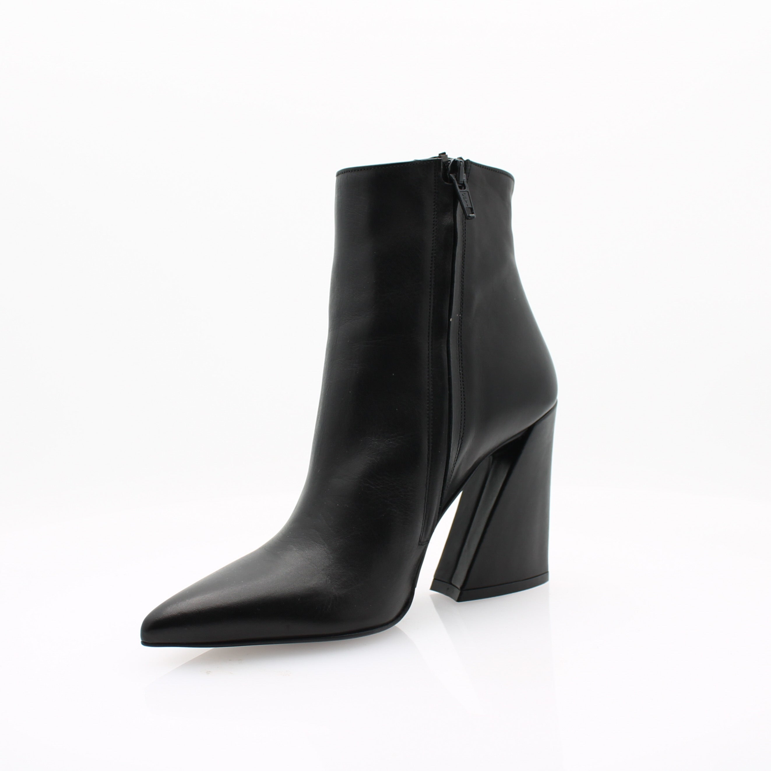 Ces bottines Albano en cuir lisse noir affichent une silhouette résolument contemporaine. Leur bout pointu confère une touche de sophistication, tandis que leur talon géométrique de 10 cm affirme un style unique et audacieux.