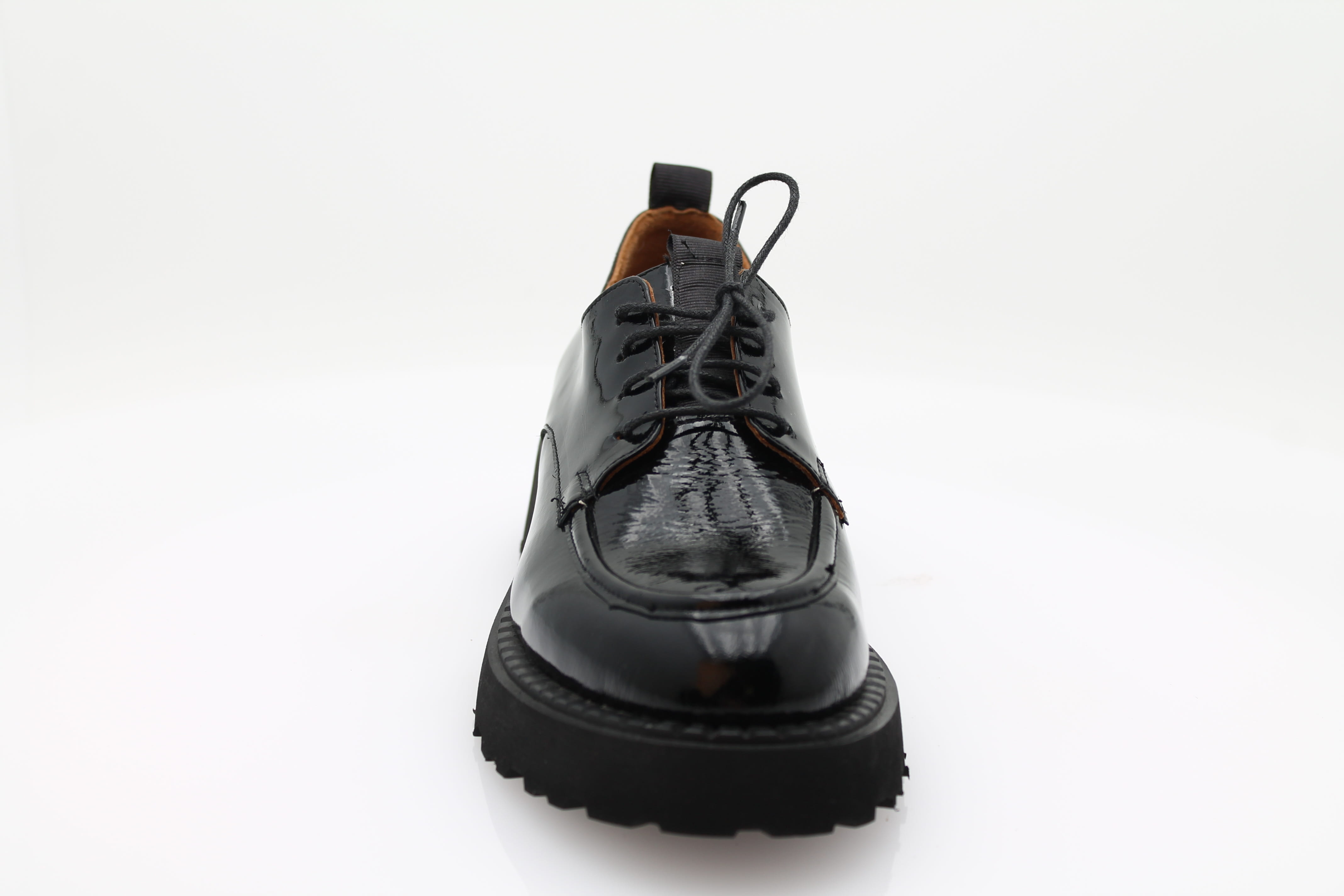 Ces derbies chunky en cuir verni noir se démarquent par leur allure audacieuse et contemporaine.