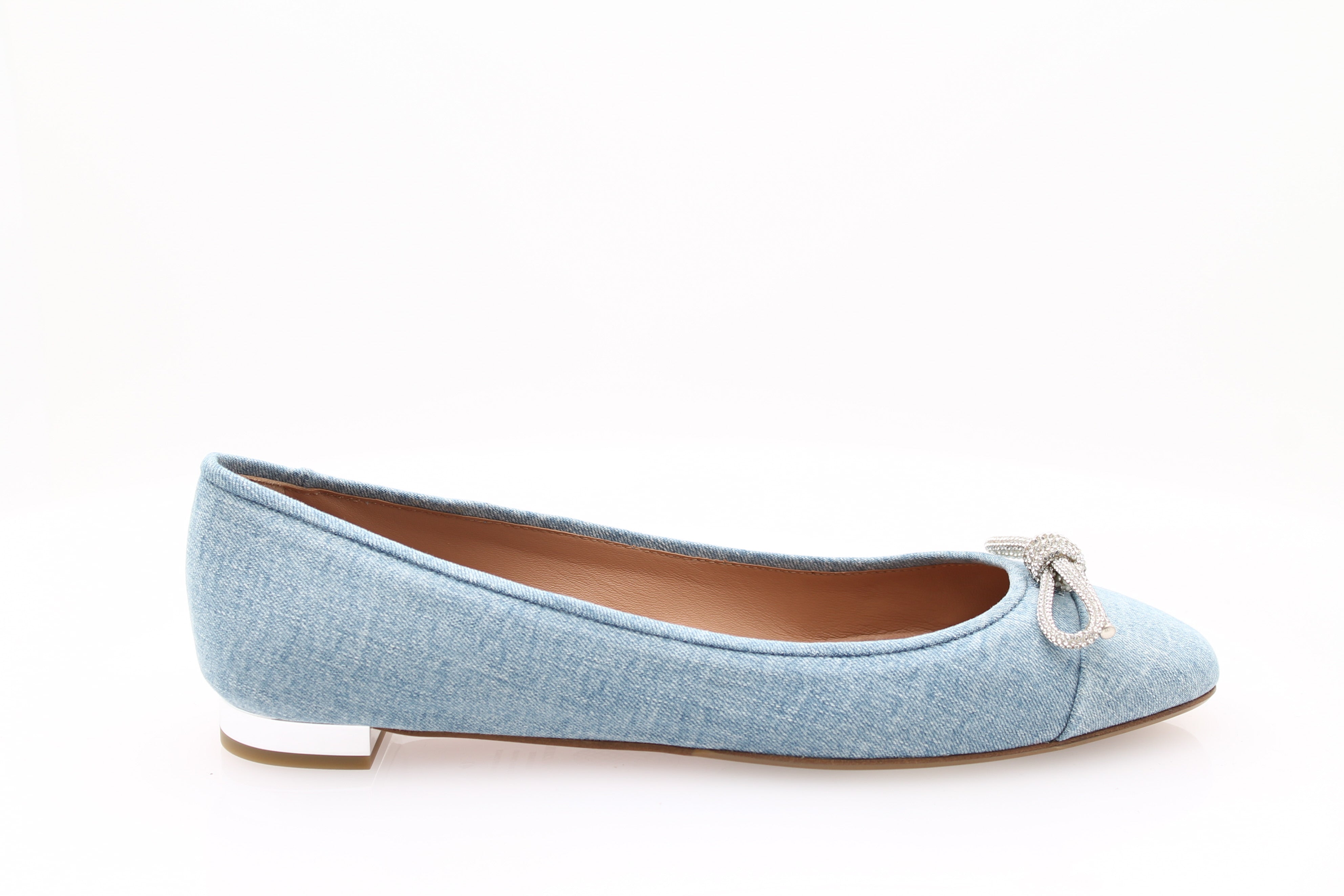 Les ballerines Aquazzura Parisina Crystal Ballet - Bleu allient le chic décontracté à une touche d'originalité. Conçues en tissu jeans/denim de qualité, elles se distinguent par un nœud argenté décoratif à l'avant qui sublime leur allure moderne. Avec un talon d'environ 0,5 pouces (10 mm), ces chaussures offrent un confort discret tout en ajoutant une note de sophistication à votre style.