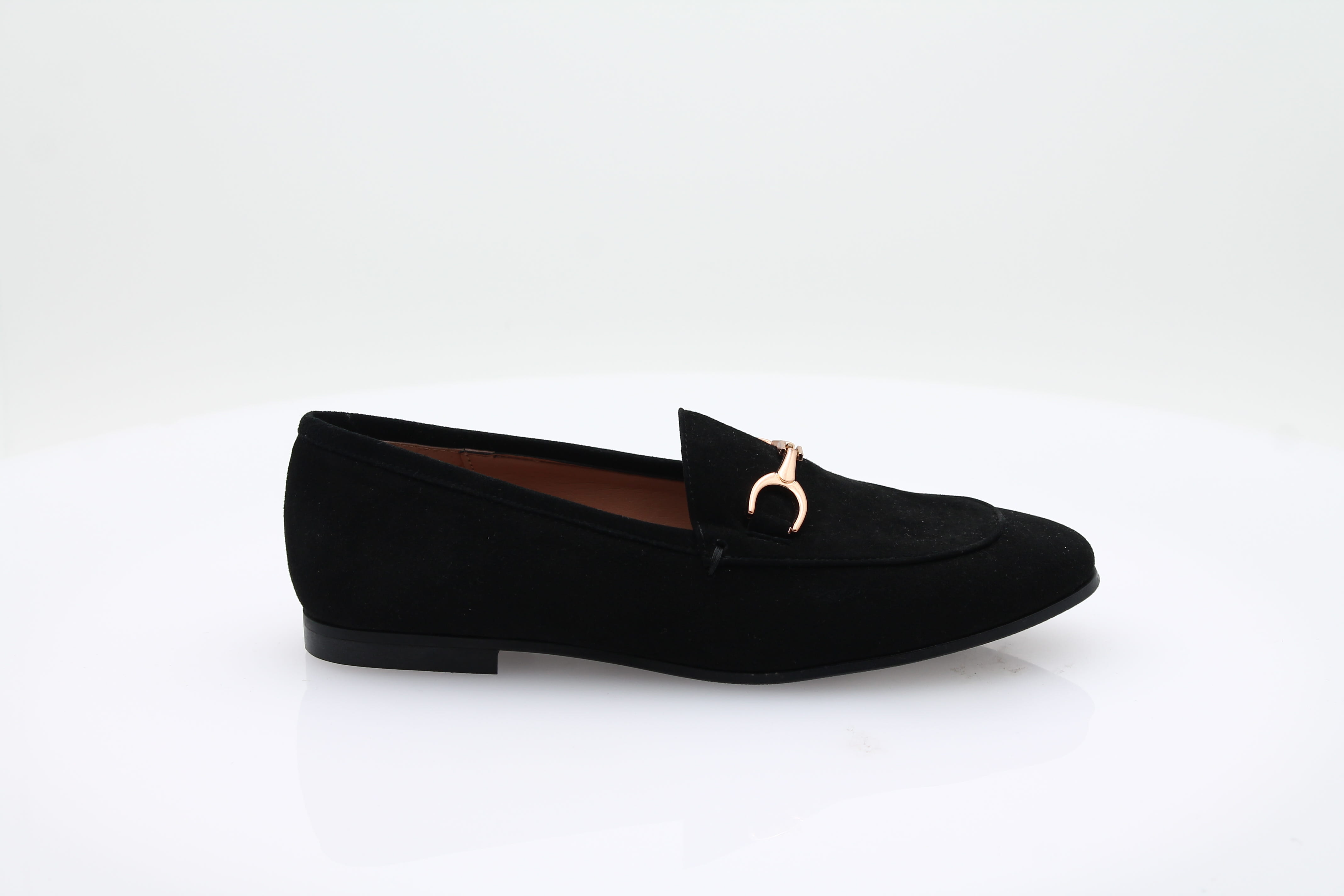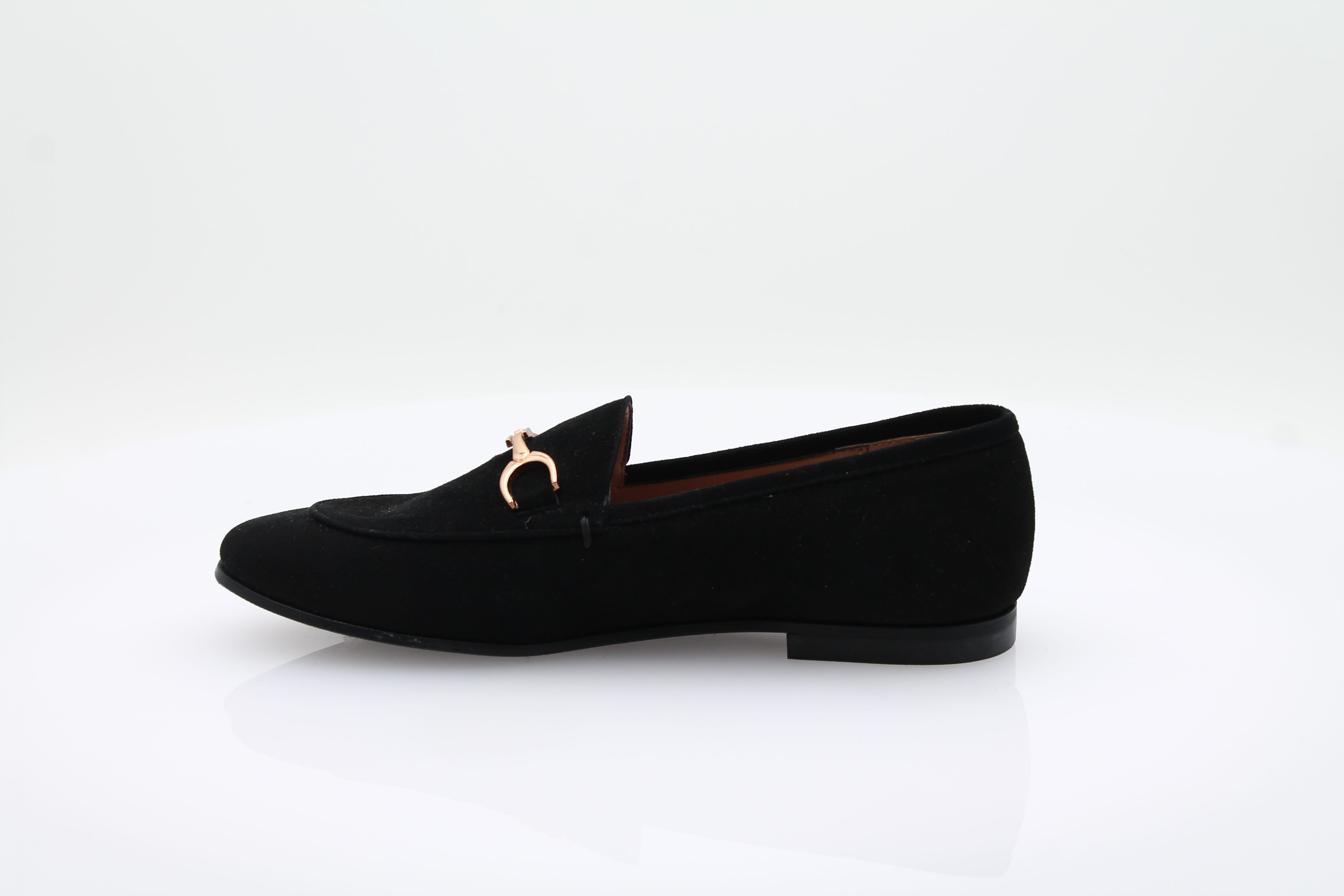 Fabriqué en Italie, ce mocassin en velours noir est orné de détails dorés.