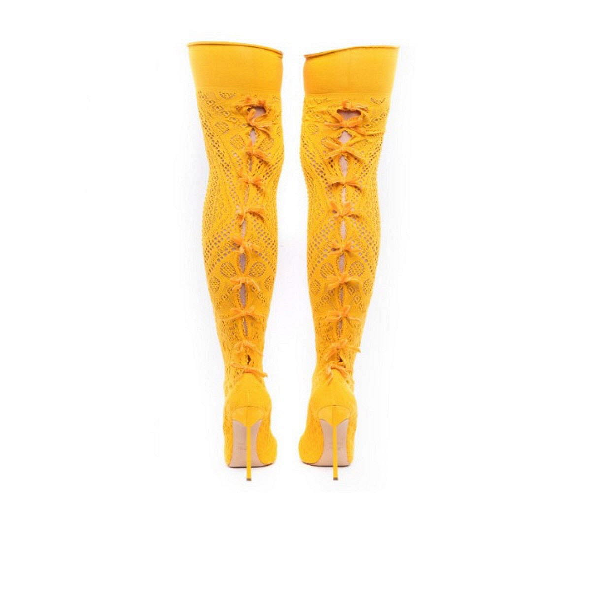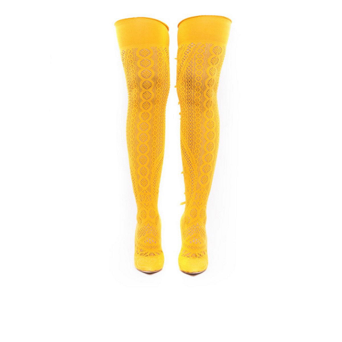 Offrez-vous le luxe ultime avec ces bottes CASADEI pour femmes en dentelle stretch en tissu tricoté jaune. Avec un talon élégant de 12 cm et des détails de nœud et de découpes, ces bottes au-dessus du genou ajouteront une touche de sophistication à votre tenue. Confortables et parfaitement ajustées, ces bottes sont un must-have pour votre garde-robe de mode.