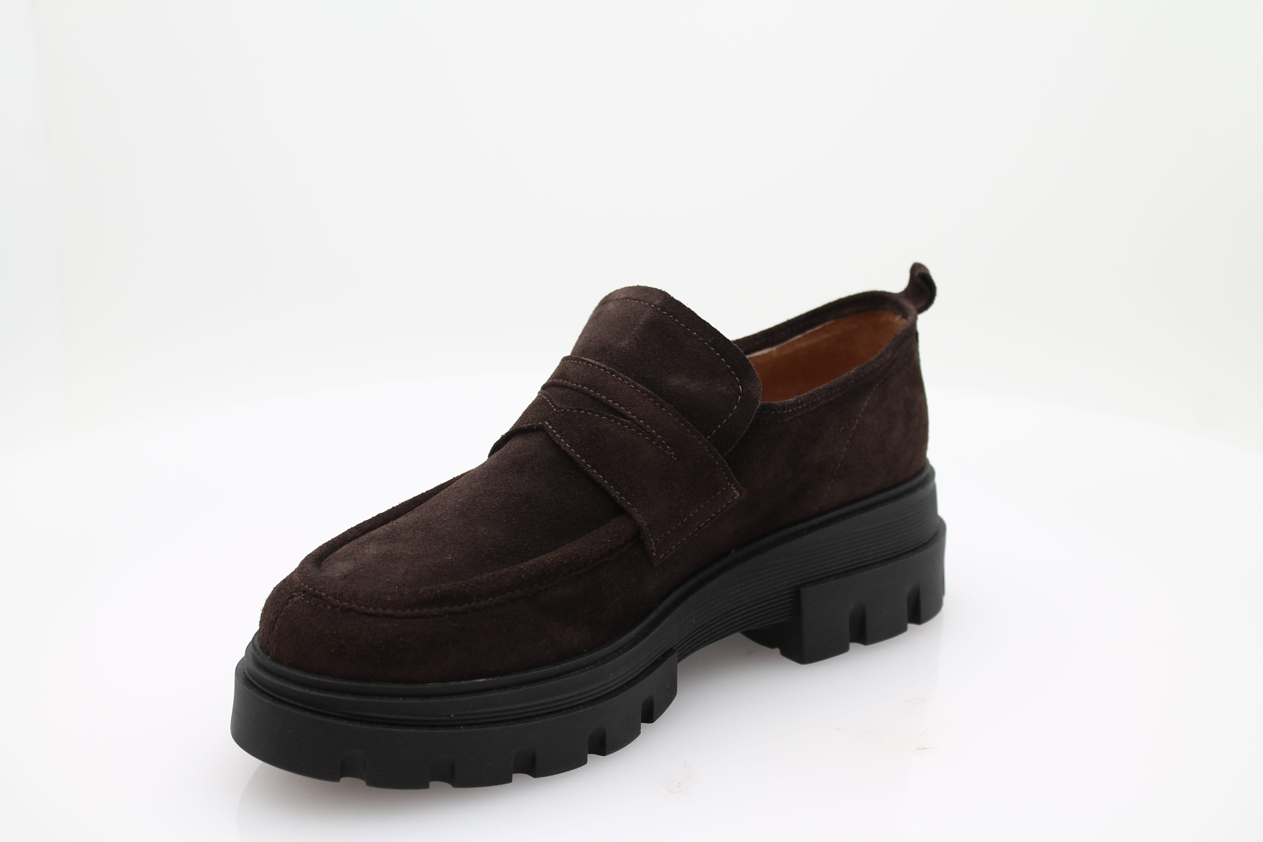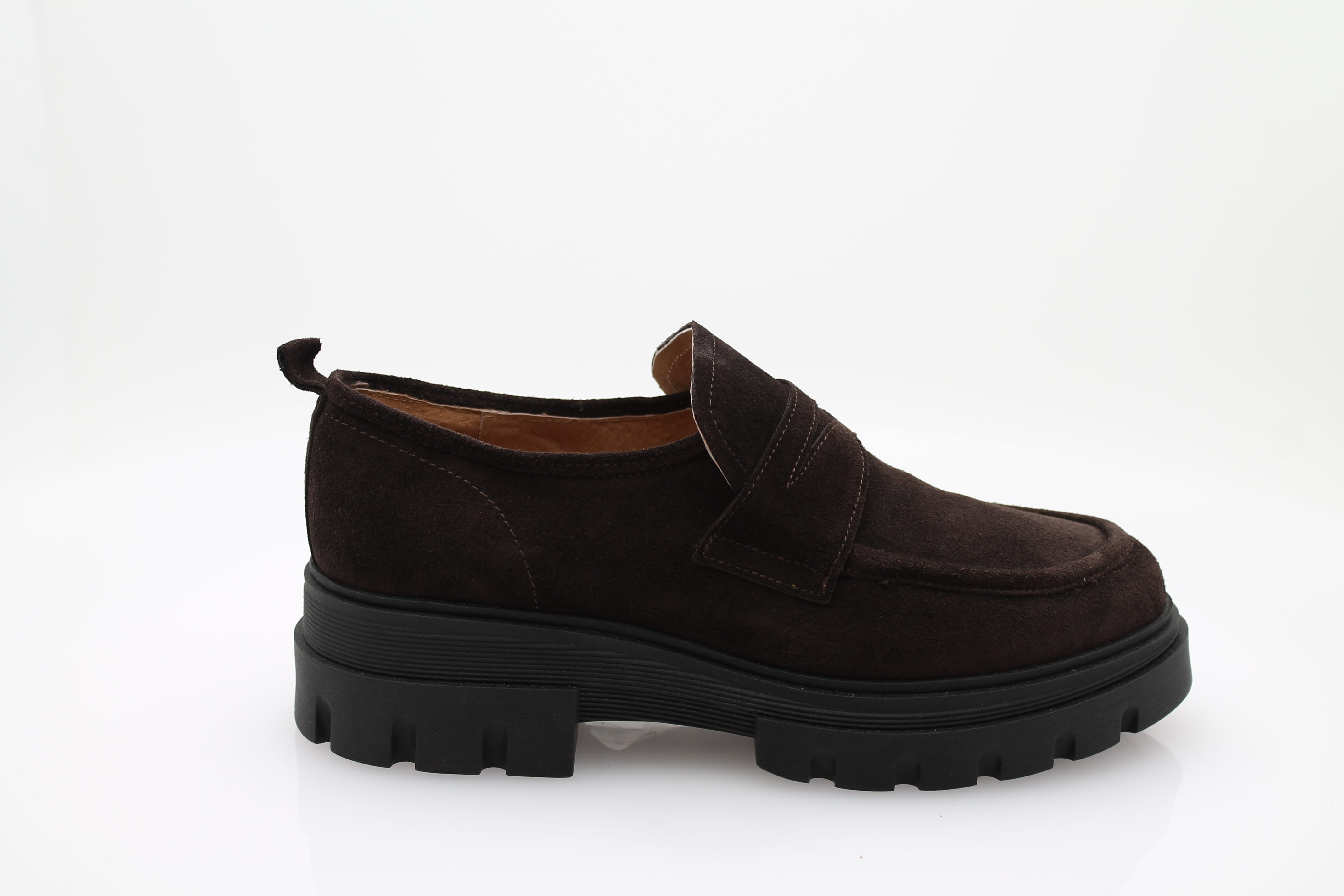 Ces mocassins en suède brun foncé allient confort et modernité grâce à leur plateforme élégante et audacieuse. Le dessus en suède doux offre une texture raffinée et un style intemporel, tandis que la semelle épaisse assure un excellent soutien et une touche contemporaine.