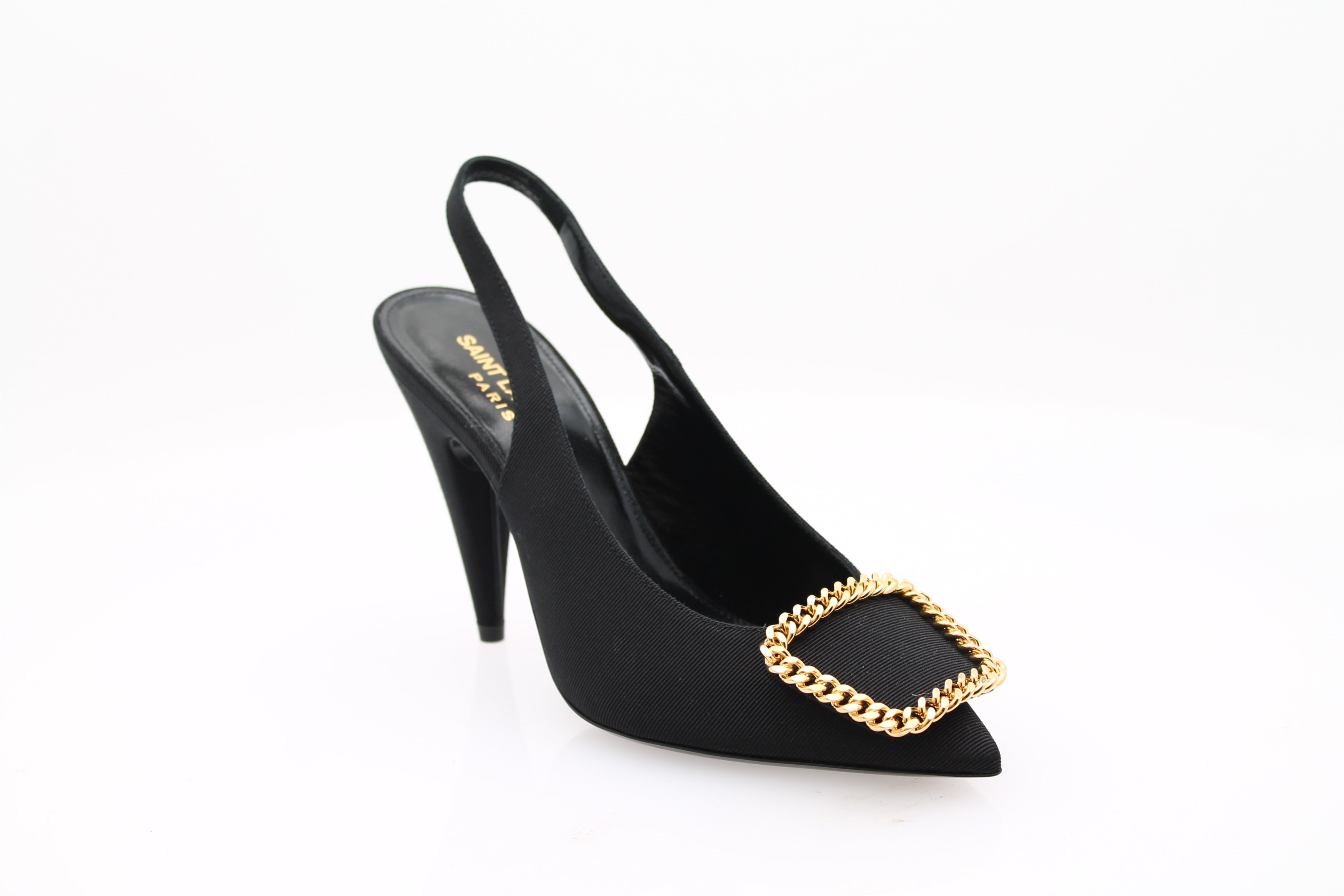 Les escarpins SAINT-LAURENT - ST Sulpice 95 Sling Penelope incarnent le luxe et le raffinement à un prix attractif. Conçus pour offrir une élégance intemporelle et un confort supérieur, ces chaussures se distinguent par leur talon de 9,5 cm et leur somptueuse décoration dorée à l'avant. La maison SAINT-LAURENT mise sur une qualité irréprochable et un design moderne, adaptés à toutes les occasions, que ce soit pour un événement professionnel ou une soirée chic.