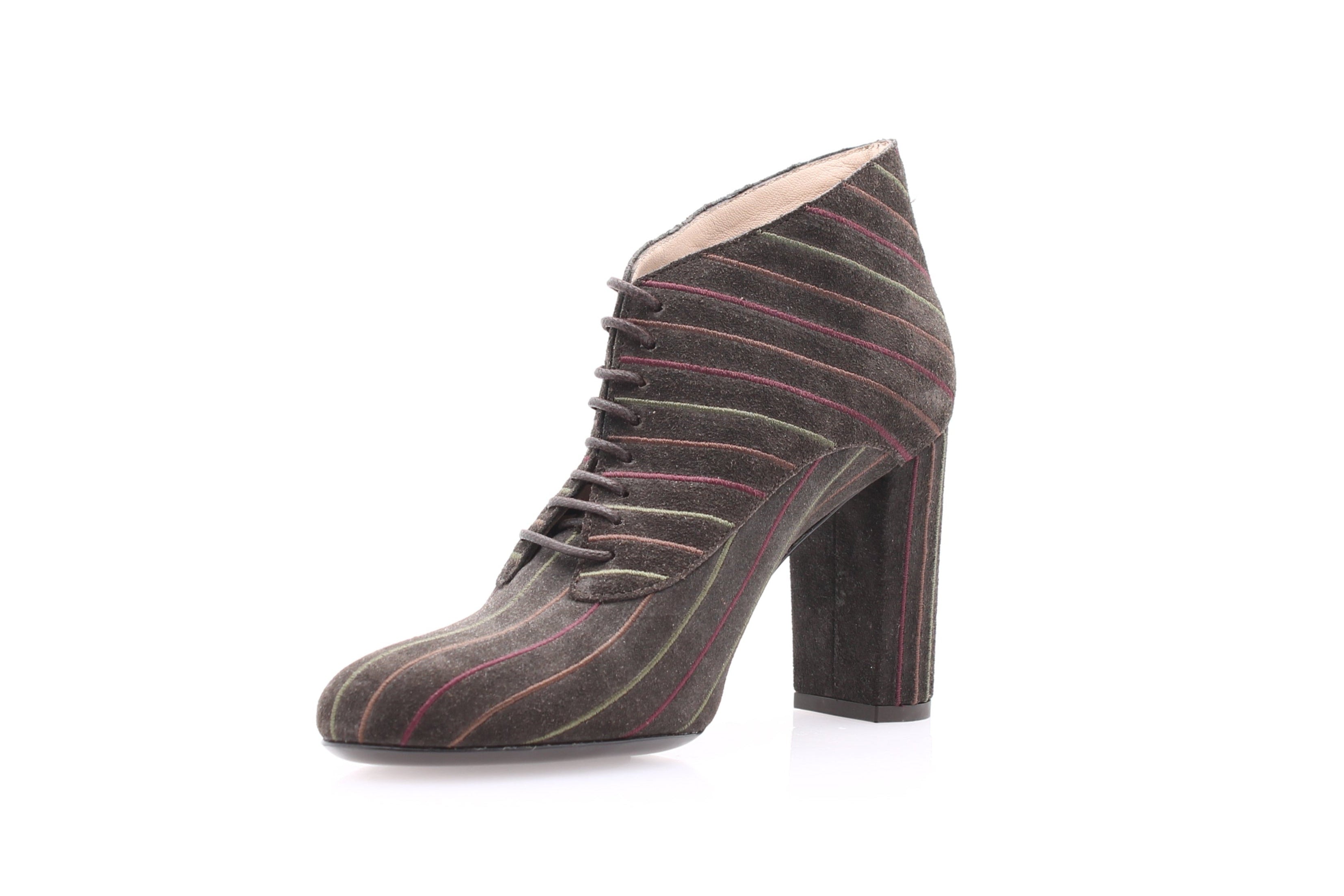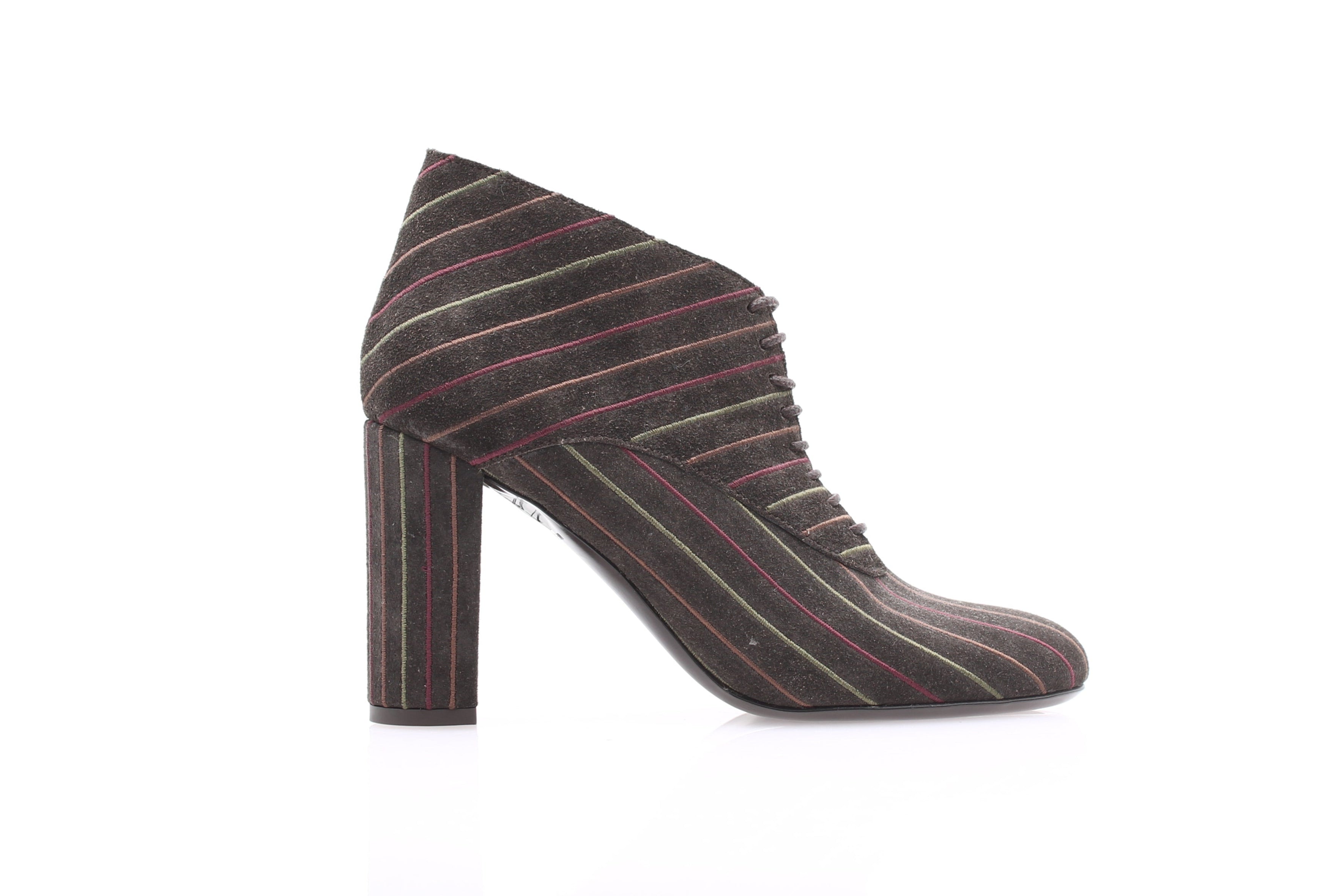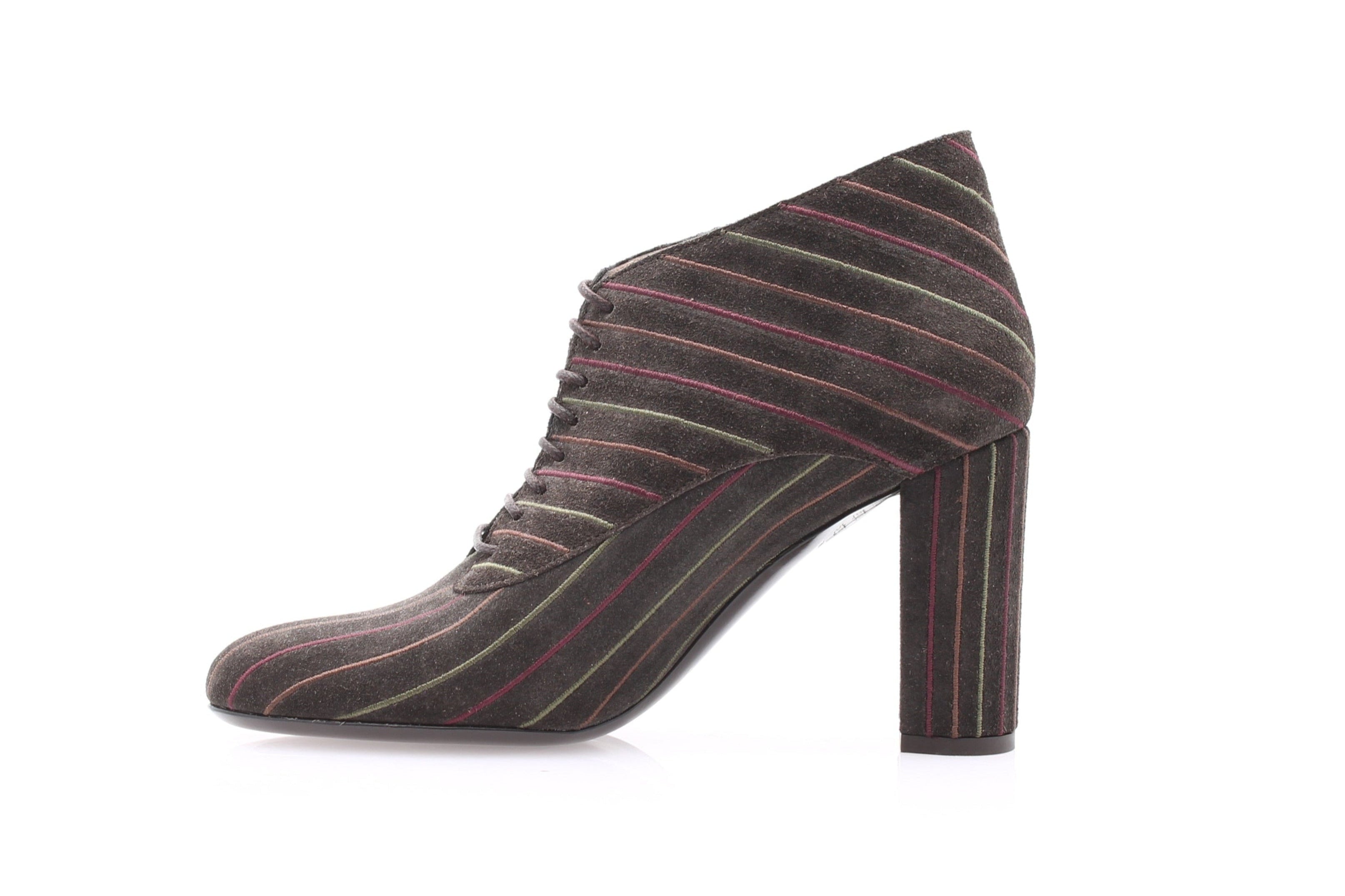 Ces bottines à lacets signées Sam Reychler revisitent le style rétro avec modernité. Confectionnées en cuir suédé à rayures multicolores, elles allient originalité et raffinement. Leur silhouette structurée et le jeu graphique des rayures verticales et obliques allongent visuellement la jambe tout en apportant une touche d’audace maîtrisée.