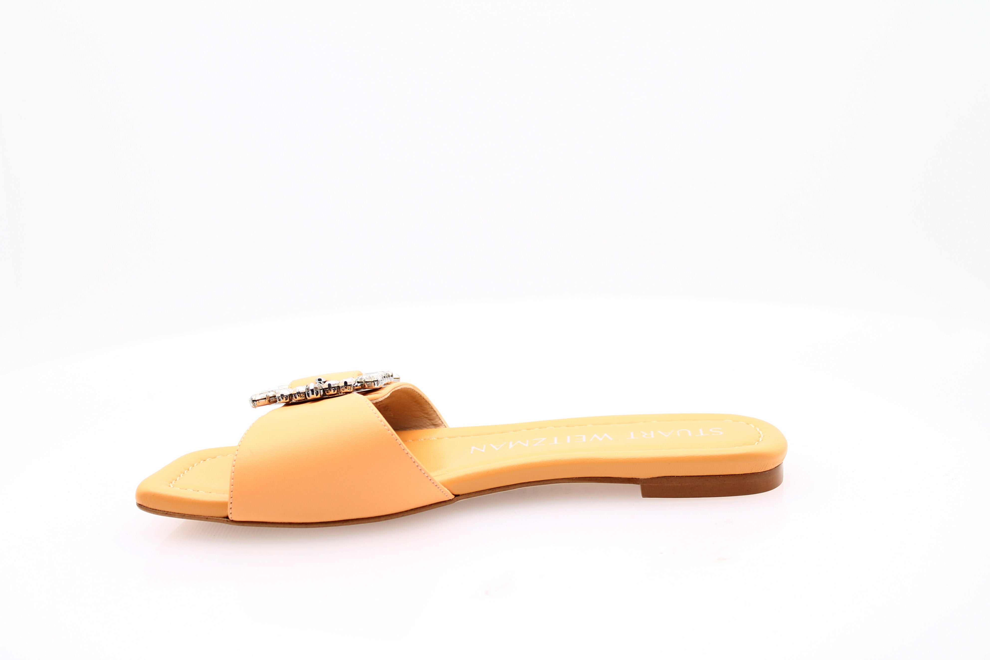 Succombez à l'élégance intemporelle des mules femmes en cuir ornées de boucles à strass de STUART WEITZMAN. Ce modèle abricot incarne parfaitement la qualité et le style de la maison. L'ajout subtil de la boucle scintillante en strass apporte une touche de glamour et de sophistication, tandis que le design élégant et moderne fait de ces mules un choix idéal pour compléter une tenue estivale.