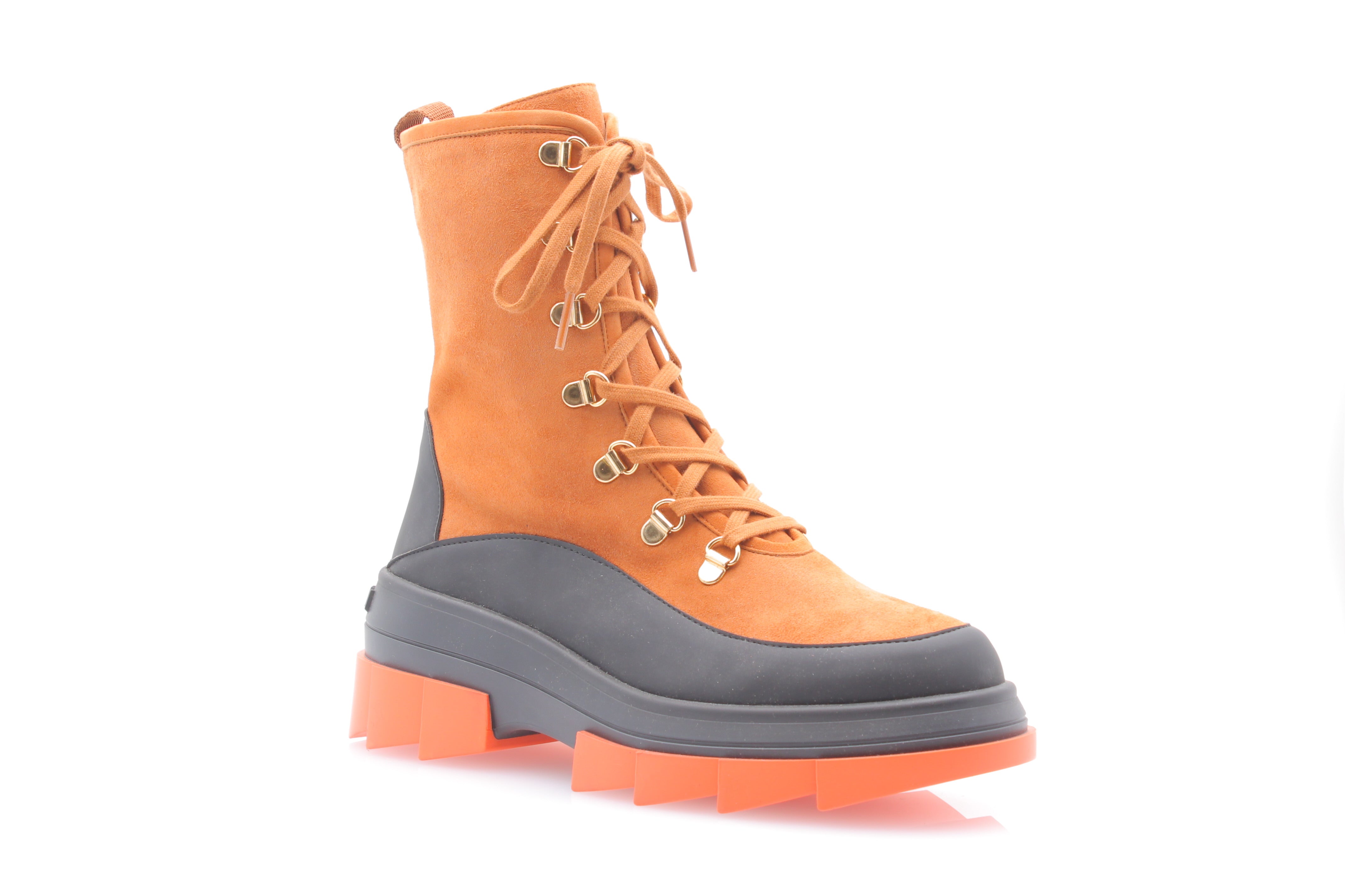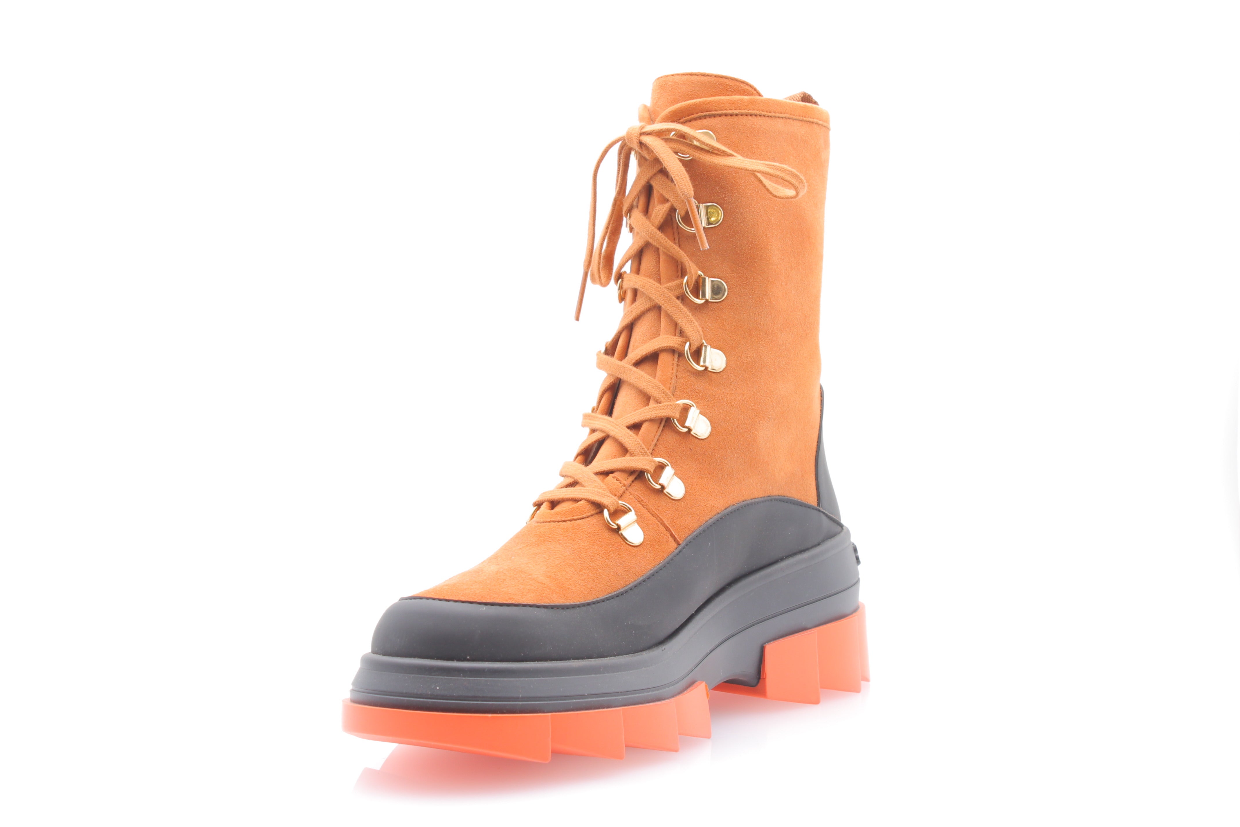 Avec la Noho Bootie, Stuart Weitzman signe une interprétation contemporaine de la bottine montante, mêlant l’esthétique workwear à une élégance structurée. Conçue en suède couleur nougat, elle séduit par ses lignes robustes et son jeu de contrastes entre la tige chaude et la semelle plateforme sculpturale. Les crochets dorés et le laçage renforcé évoquent l’esprit randonnée chic, parfait pour les exploratrices urbaines.