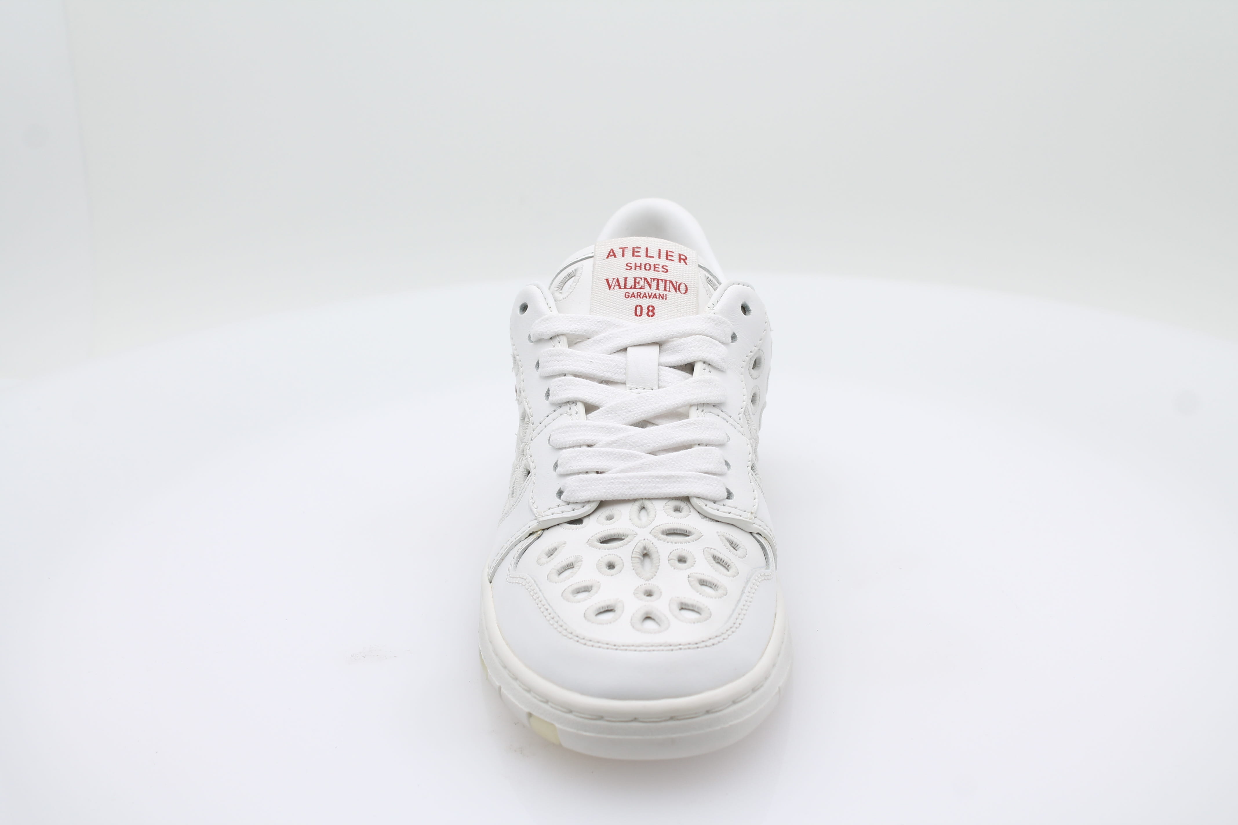Fabriquée en cuir blanc de haute qualité, elle présente une écriture rouge audacieuse et des détails perforés pour un look unique.