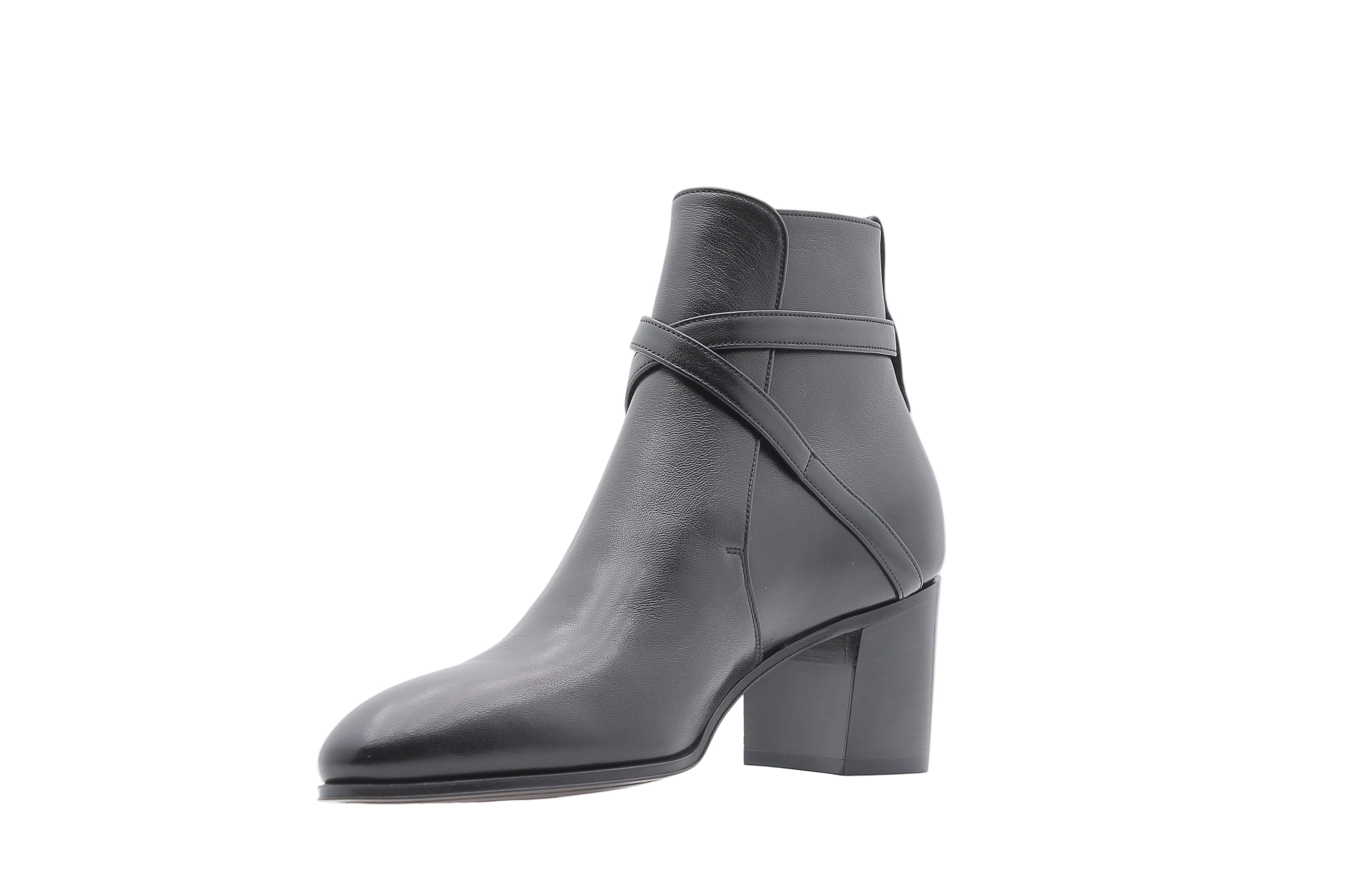 La Roma 70 Bootie de Saint Laurent incarne la fusion parfaite entre punk raffiné et esprit rock parisien. Conçue dans un cuir lisse noir éclatant, elle révèle une coupe épurée jusqu’à la cheville, rehaussée d’un bout amande intemporel. La chevillère croisée à boucles métalliques confère une note graphique audacieuse, affirmant une forte personnalité visuelle.